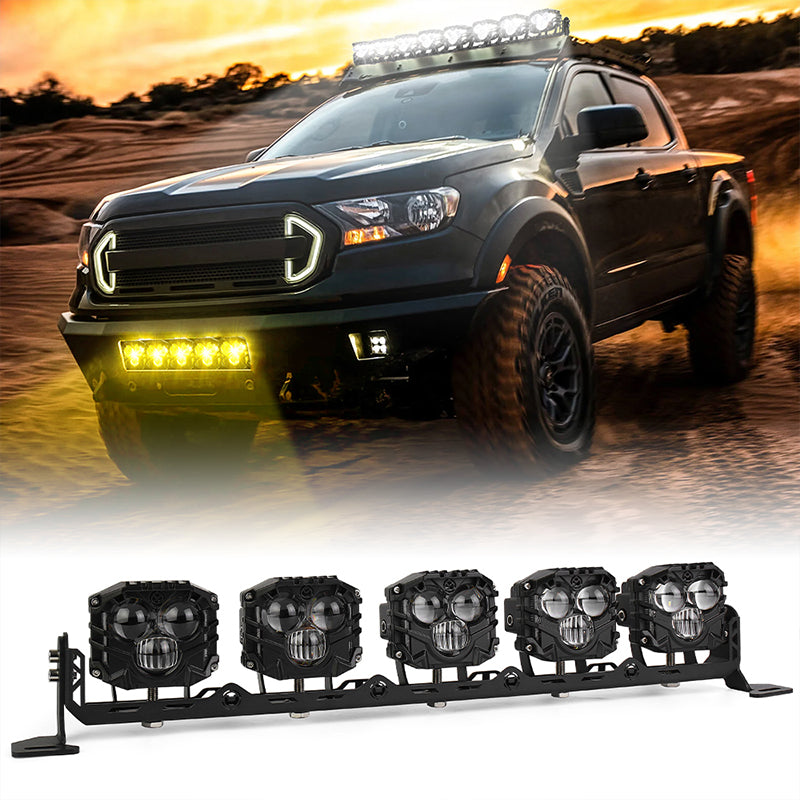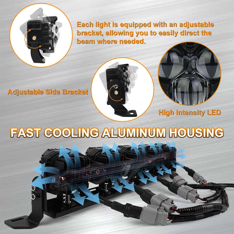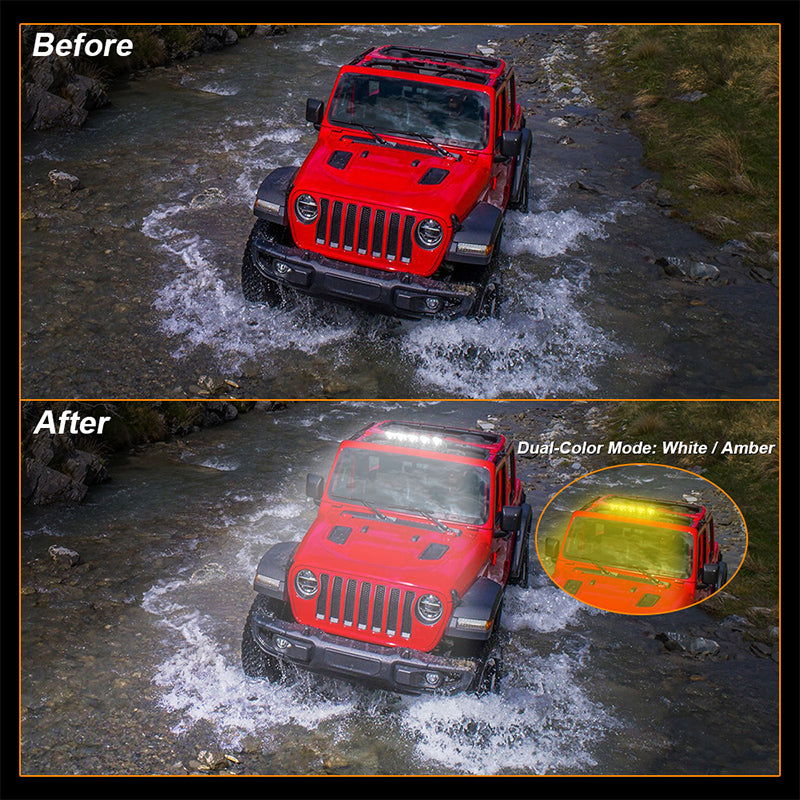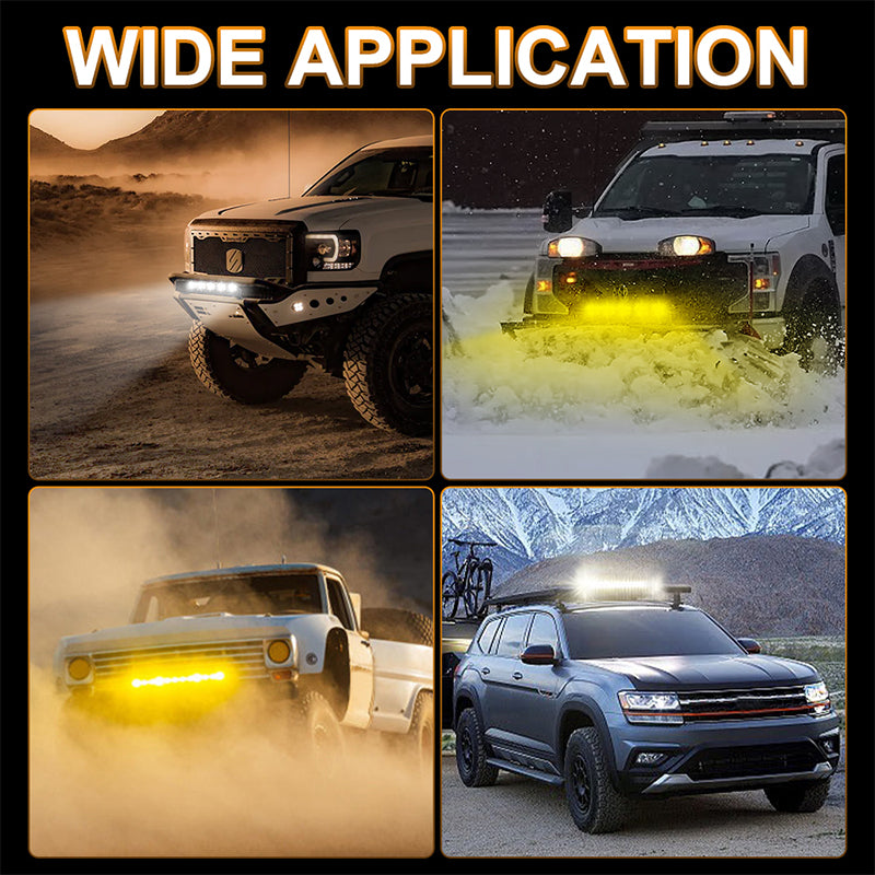 Excellent Performance: The off road with strong penetrating amber light bar has been tested with an IP68 waterproof rating and can perfectly meet various daily and special needs like car washing,rain,snow,off-roading,mud and so on.Aluminum fan-shape housing design+Individual lights,heat dispersion and effective heat dissipation.