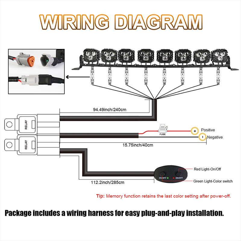 -- Assembly Required: The dual color light bar comes with wiring harness kit,the length can be up to 20ft with on/off switch,plug&play,easy installation.Note:Received lights are all individual and need to be assembled by oneself,it’s simple but takes time.