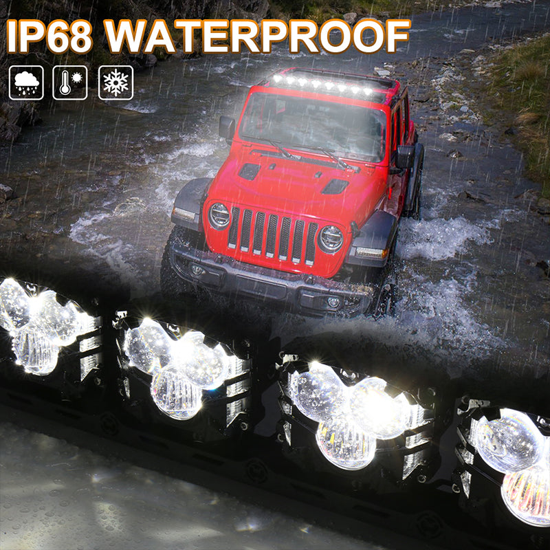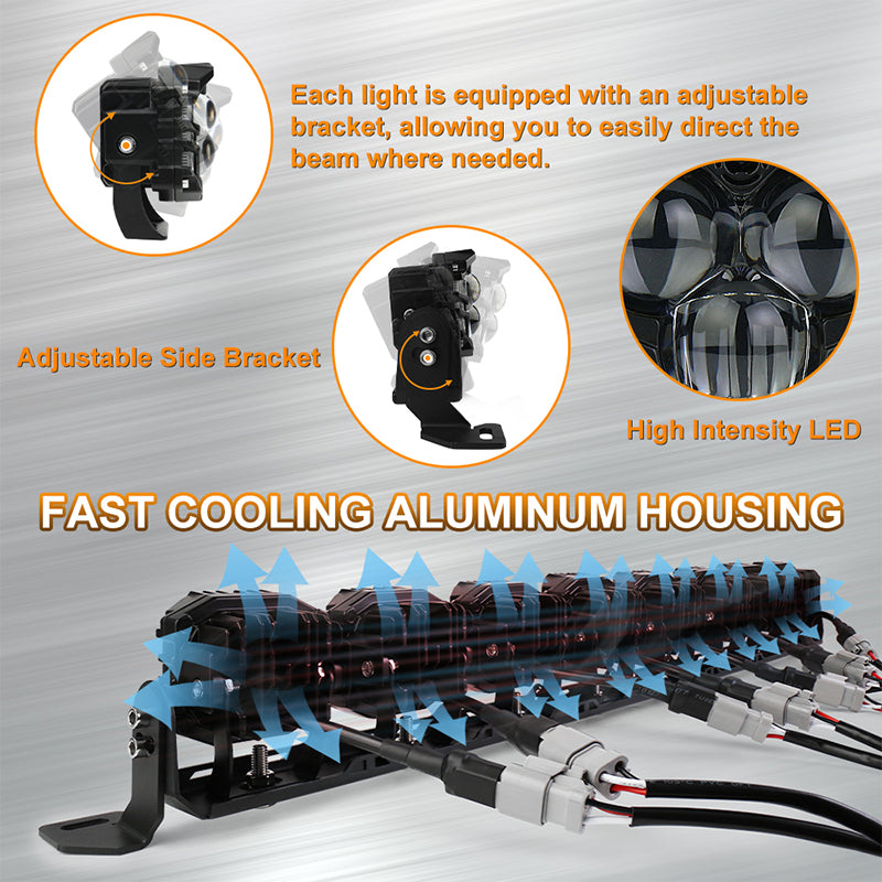 -- Excellent Performance: The off road with strong penetrating amber light bar has been tested with an IP68 waterproof rating and can perfectly meet various daily and special needs like car washing,rain,snow,off-roading,mud and so on.Aluminum fan-shape housing design+Individual lights,heat dispersion and effective heat dissipation.