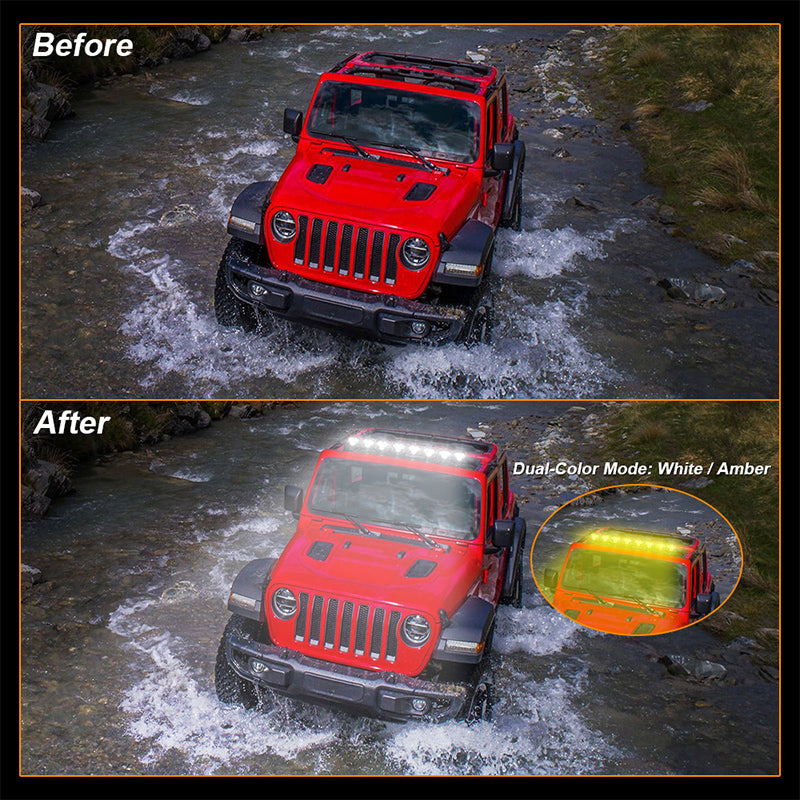 -- Enhanced Visibility: This 32-inch LED light bar features high-intensity LEDs. It significantly expands the illuminated area on the road surface, enhancing driving safety and reliability. The dual-color design offers both white and amber lighting, better meeting the needs of different driving conditions/scenarios.